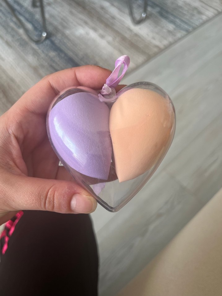 Pastel mor ve şeftali renklerinde kalp şeklinde makyaj süngerleri, askı halkalı şeffaf plastik kutuda.