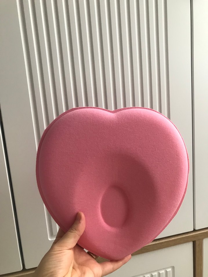 Pastel pembe renkte, kalp şeklinde, desensiz ve yumuşak plastik malzemeden yapılmış çocuk yastığıdır.