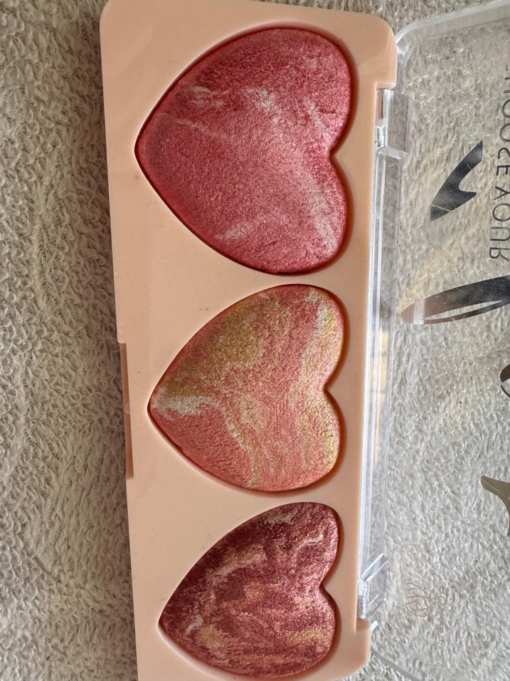 Üç kalp şeklinde açık pembe allık tonları içeren, yumuşak ve parlak bir görünüm sunan palet.