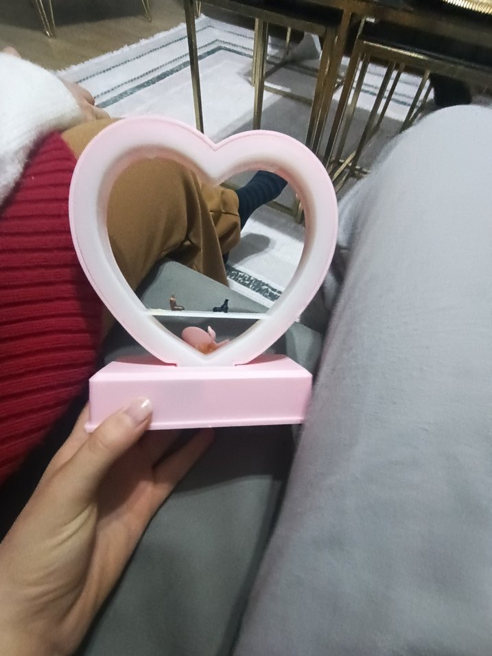 Pembe kalp şeklinde masa aynası, sağlam tabanı ile kullanıma uygundur. Açık renk tasarımı mekâna yumuşak bir hava katar.