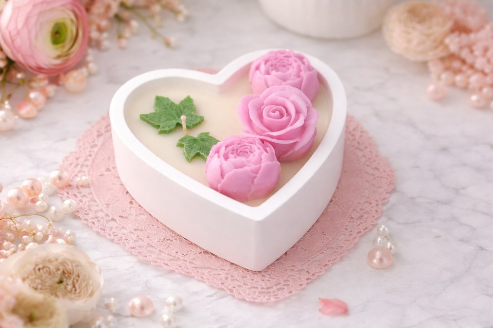 Kalp şeklinde, pastel pembe çiçek desenleri ve yeşil yaprak detaylarıyla zarif ve şık bir mum