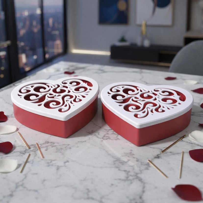 Canlı kırmızı renkte, beyaz oymalı kapaklı kalp şeklinde hediye kutuları .