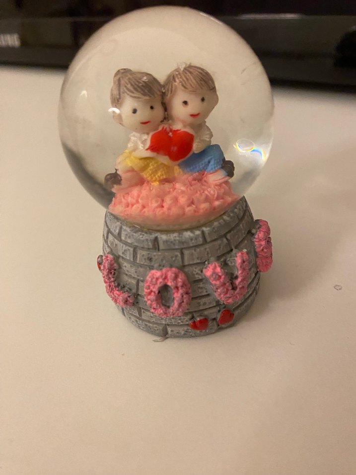 Renkli kar küresi içinde kalp tutan çift figürü, altı pembe "LOVE" yazılı detaylı tabanla süslenmiştir.