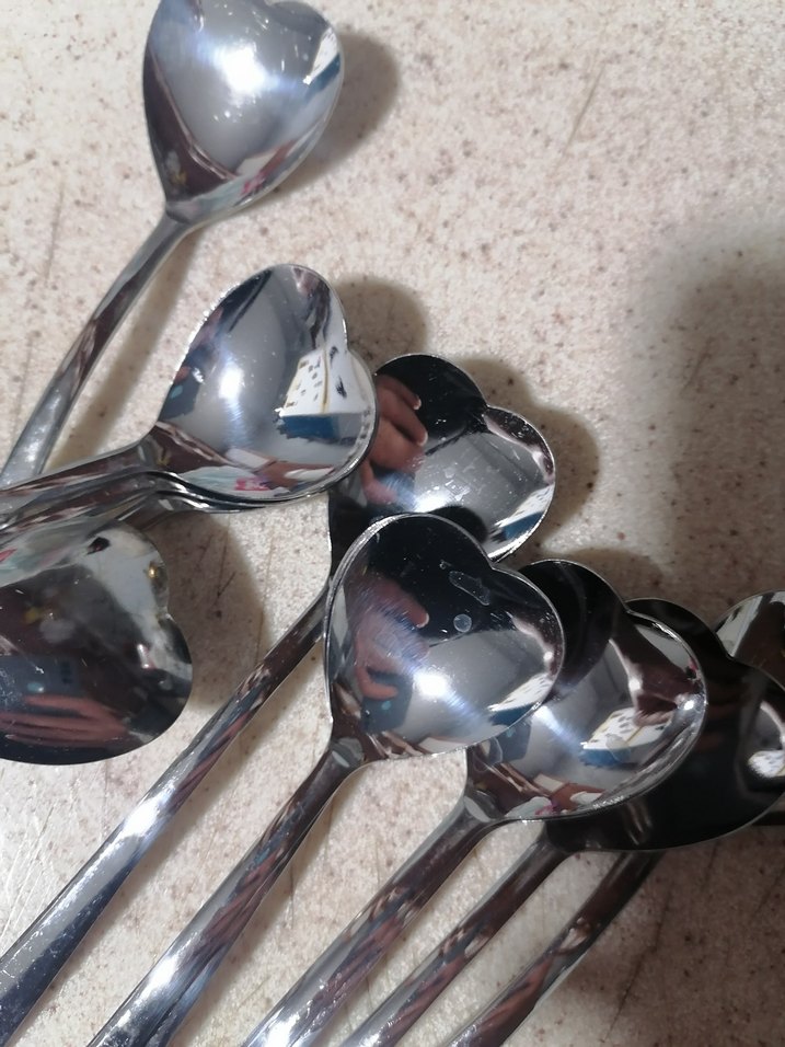 Yansıtıcı metalden yapılmış, kalp uçlu gümüş renkli çay kaşıkları seti. çeliktir çok kullanılmadı dolapta duruyordu çok iyi durumda