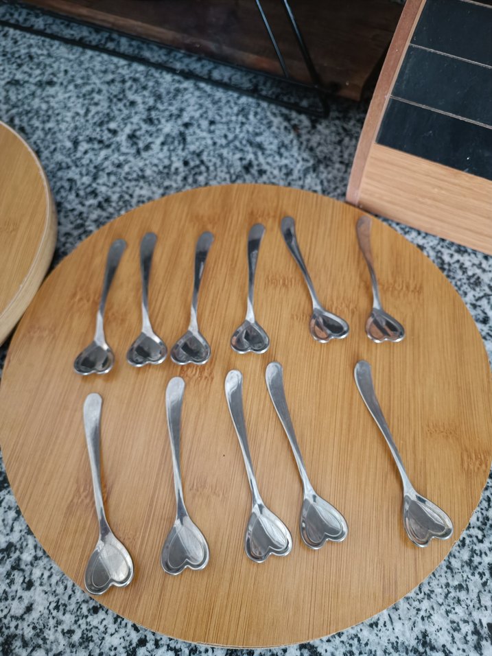 Kalp uçlu metal çay kaşıkları seti, şık gri renkte. Çay saatlerine hoş bir dokunuş sağlar. ☕