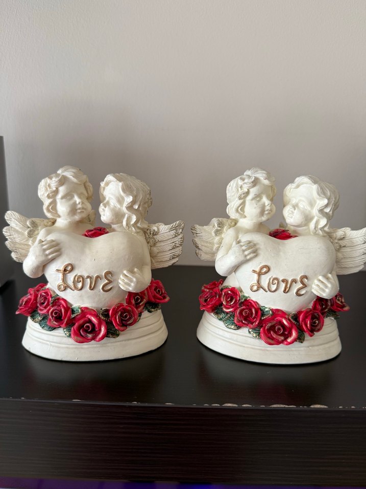 'Love' yazılı kalp tutan beyaz melek figürleri, tabanda kırmızı güllerle süslü. Renkli ve romantik tasarım.