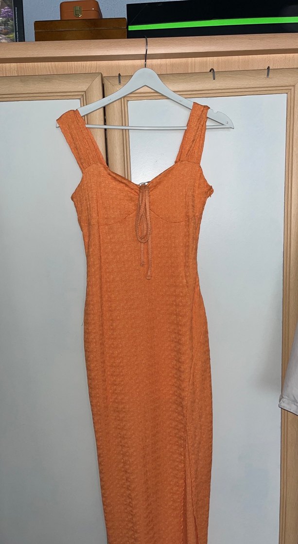 Kalp yaka ve bohem tarzda, ince keten kumaştan yapılmış, drapeli ve parlak turuncu renkte günlük veya yazlık uzun elbisedir.