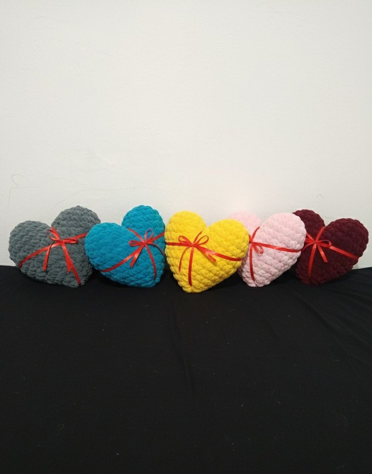 Yumuşak dokulu, kırmızı kurdeleli renkli kalp yastık renk seçenekleri mevcuttur kişiye özel örülür sipariş alınır