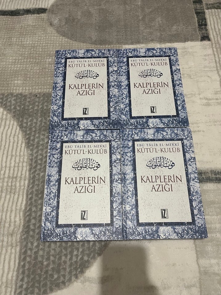 Ebu Talib El-Mekkî'nin Kütül-Kulub serisinden Kalplerin Azığı adlı kitabın birden fazla kopyası. Mavi desenli kapaklar ve beyaz zemin içerir.