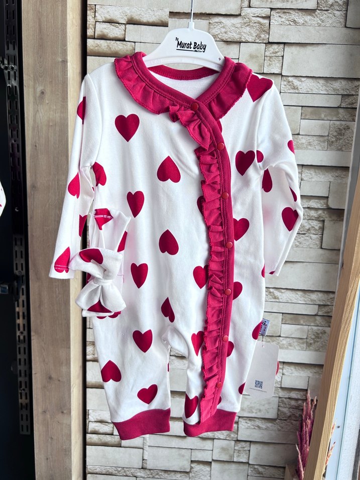 Bebek kız tulumu, renkli kalp desenleri ve ön ile manşetlerde fırfır detaylarına sahiptir. Beyaz zemin üzerinde canlı kırmızı tonlarda yumuşak kumaşlıdır. ❤️0-3/3-6/6-9/9-12 beden seçenekleri mevcuttur.
