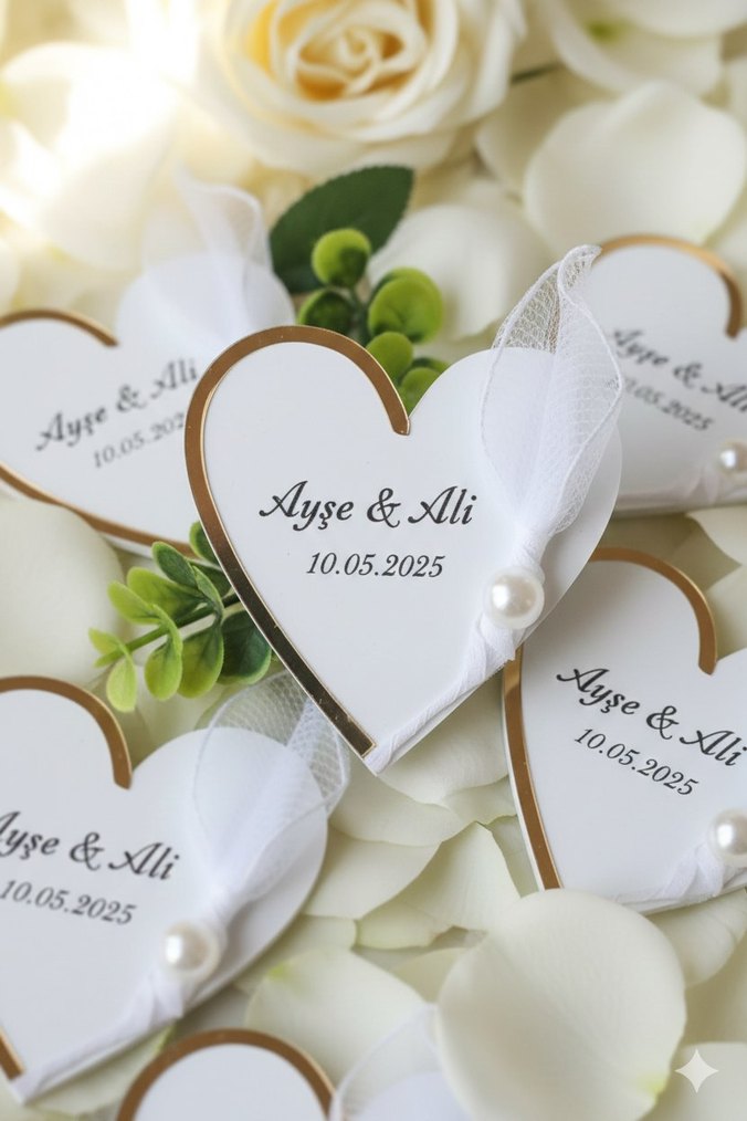 Altın kenarlı, tül ve inciyle süslenmiş beyaz kalp şeklinde düğün hediyesi, isim ve tarih kişiselleştirilmiş.