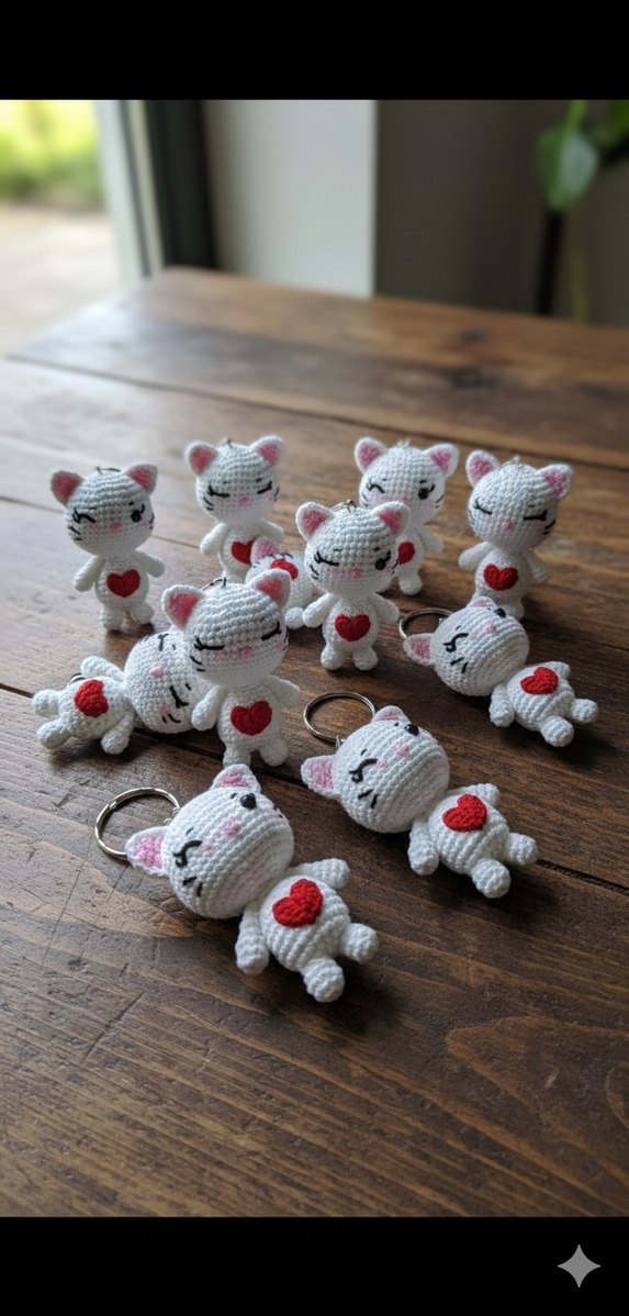 Kırmızı kalp detaylı beyaz örgü kedi anahtarlıklar, çeşitli sevimli ifadelerle. Renkli ve şirin kedi aksesuarları.