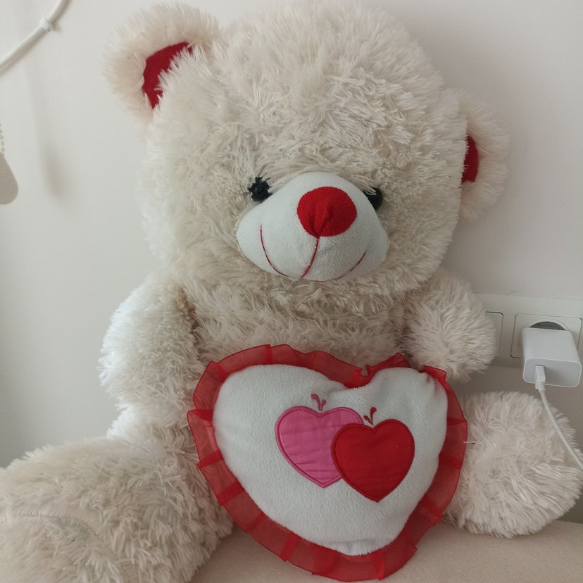 Yumuşak beyaz peluş ayı, kalp şeklinde kırmızı ve pembe renkli kalpler taşıyan bir yastık tutuyor. Kulakları ve burnu kırmızı, canlı detaylar içeriyor.