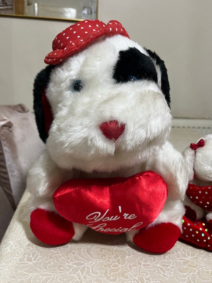 Yumuşak beyaz peluş köpek, üzerinde 'You're special' yazılı kırmızı kalp tutuyor, kırmızı puantiyeli fiyonk ve kırmızı detaylara sahip.