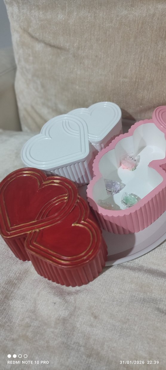 Pastel pembesi, beyaz, mavi ve kırmızı kalp şeklinde küçük saklama kutuları. elimde olan diğer renklere isteğe göre boylanabilir