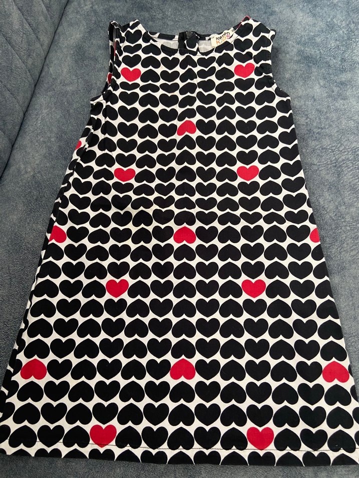Kolsuz, kalp desenli, tekne yakalı, yumuşak sentetik kumaştan yapılmış, vücuda oturan kız çocuk elbisesi. ❤️