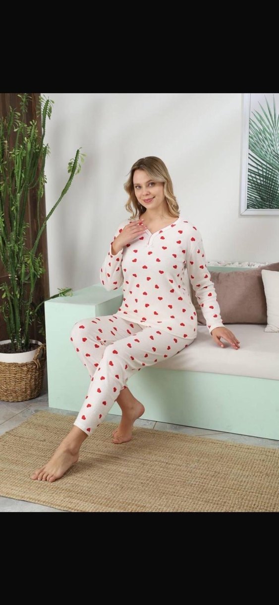 Beyaz zemin üzerine kırmızı kalp desenli, uzun kollu ve bol kesim kadın pijama takımı. Rahat ve sıcak bir uyku için ideal. ❤️