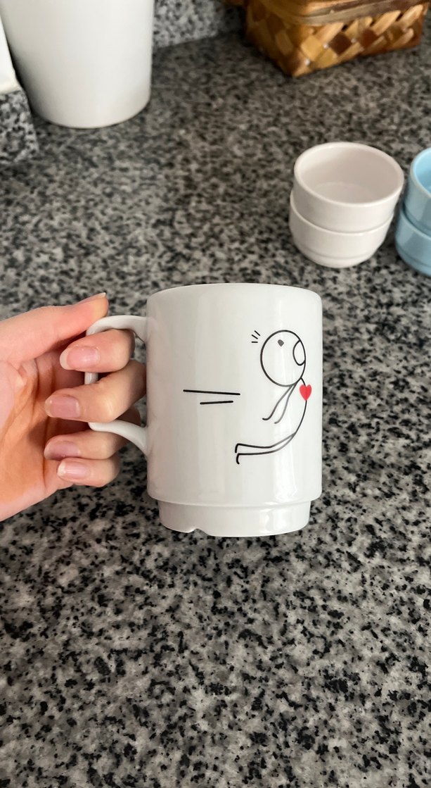 Beyaz seramik kupa üzerinde kırmızı kalp tutan sade bir figür bulunur. Minimalist ve şık tasarım. ☕