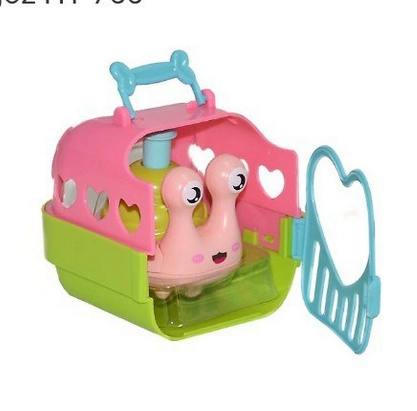 Pastel pembe ve yeşil renklerde, kalp şeklinde kesiklere sahip oyuncak taşıma kutusu. İçinde sevimli salyangoz figürü bulunur, mavi saplı ve ön kapak açılır.