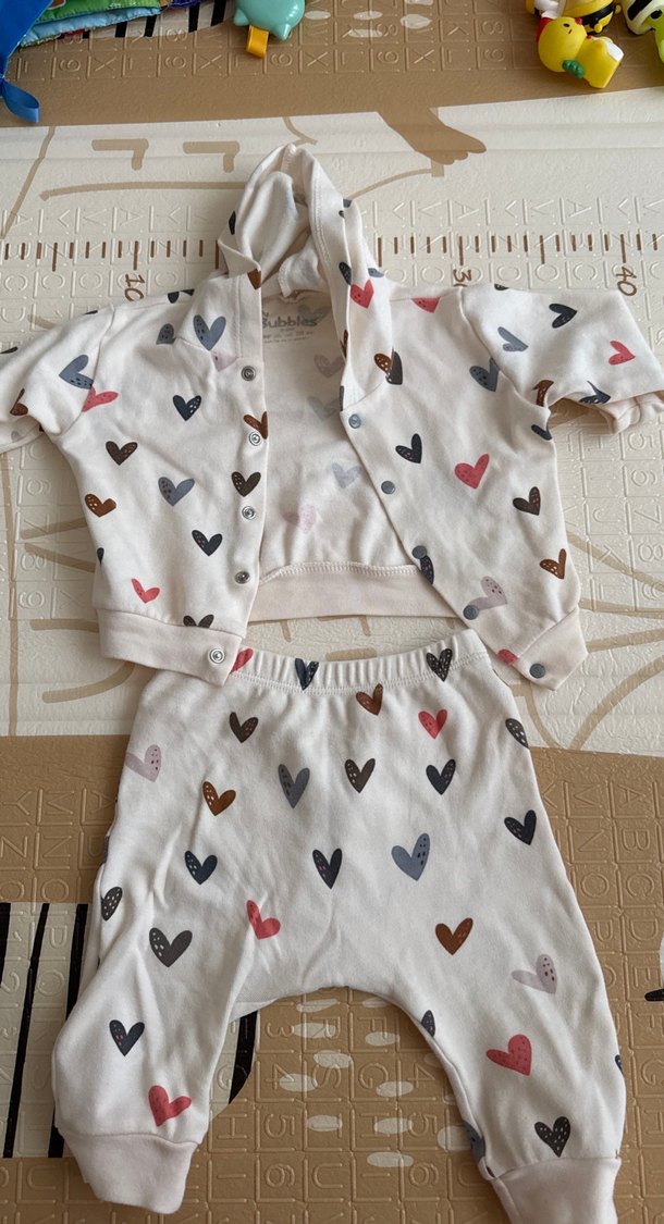 Uzun kollu, düğmeli kız takımı, renkli kalp desenleriyle süslenmiştir. 3-6 ay