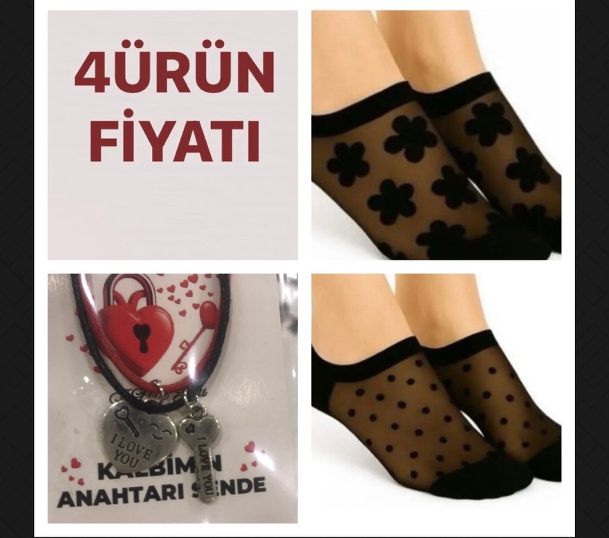 4 ürün kartlı paketinde kalp kolye anahtar kolye 2 çift tül çorap ((sepete ürün ekle toplu indirim geçerli değildir))