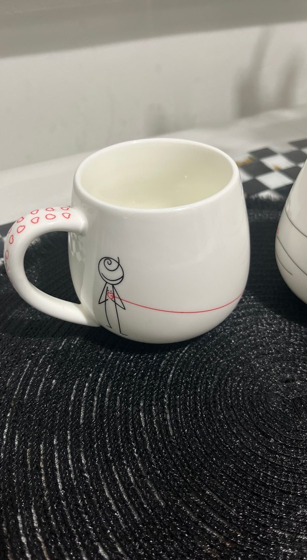 Kalpli kulplu ve çizgi desenli beyaz seramik kupa. ☕
