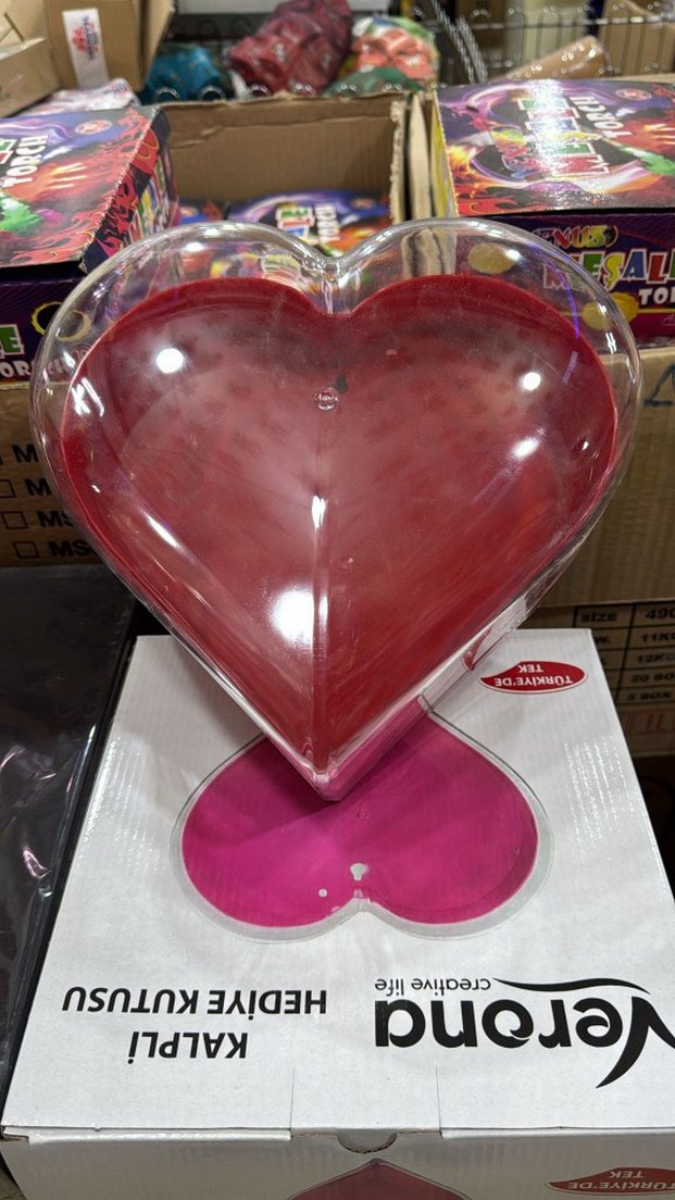 Canlı pembe renkte, kalp şeklinde dudak parlatıcısı, şeffaf plastik kutuda.