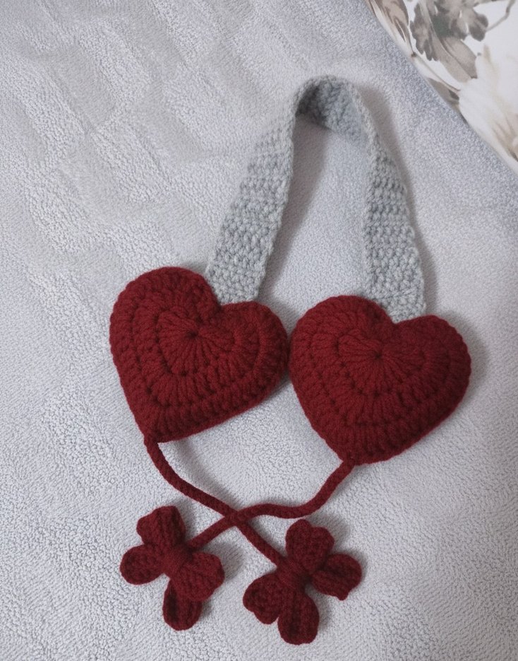 Gri askılı bordo kalp şeklinde, nakışlı örgü kız aksesuarı. Bohem tarzda, retro ve hippie görünüm için uygundur. ❤️