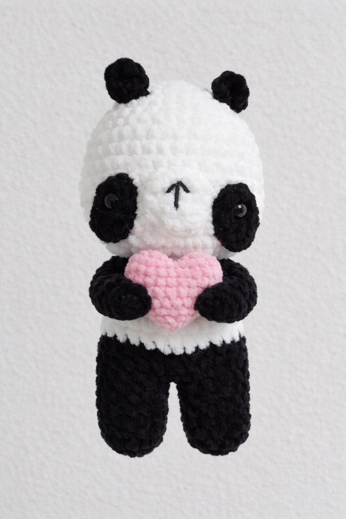 Yumuşak peluş panda oyuncak, pastel pembe kalp tutuyor. Siyah ve beyaz renklerde dokulu yüzeye sahiptir.