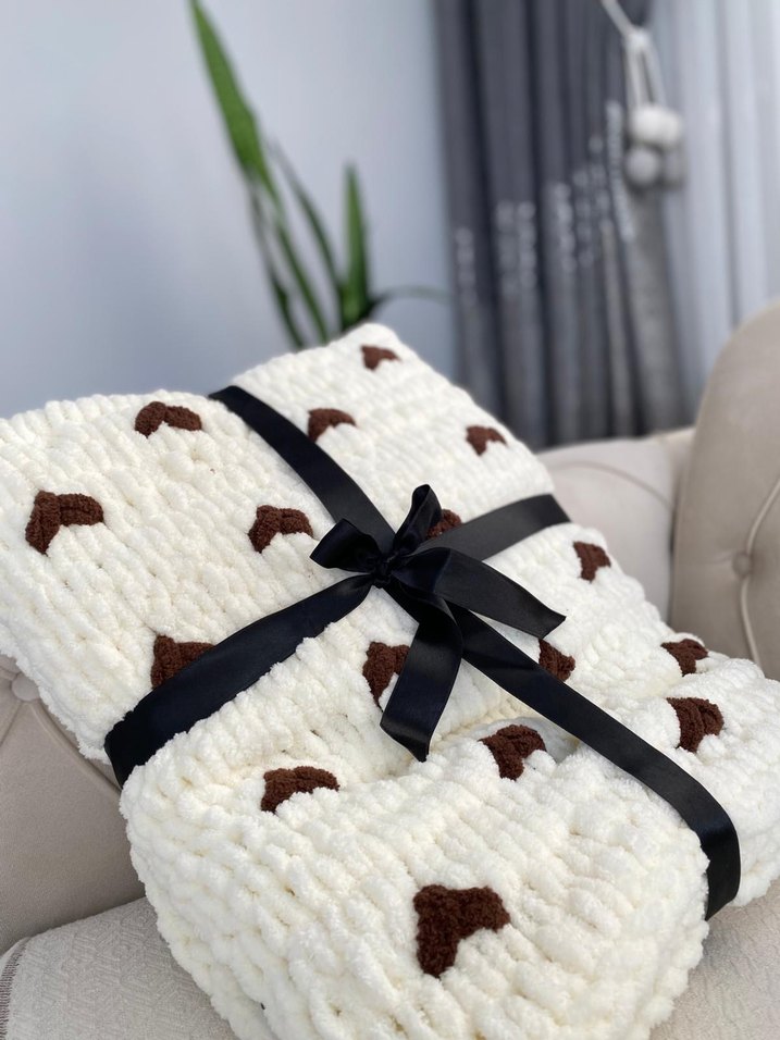 Koyu kalp desenleriyle beyaz örgü battaniye, yumuşak ve sıcak tutar. Ölçüleri 90*90 cm'dir