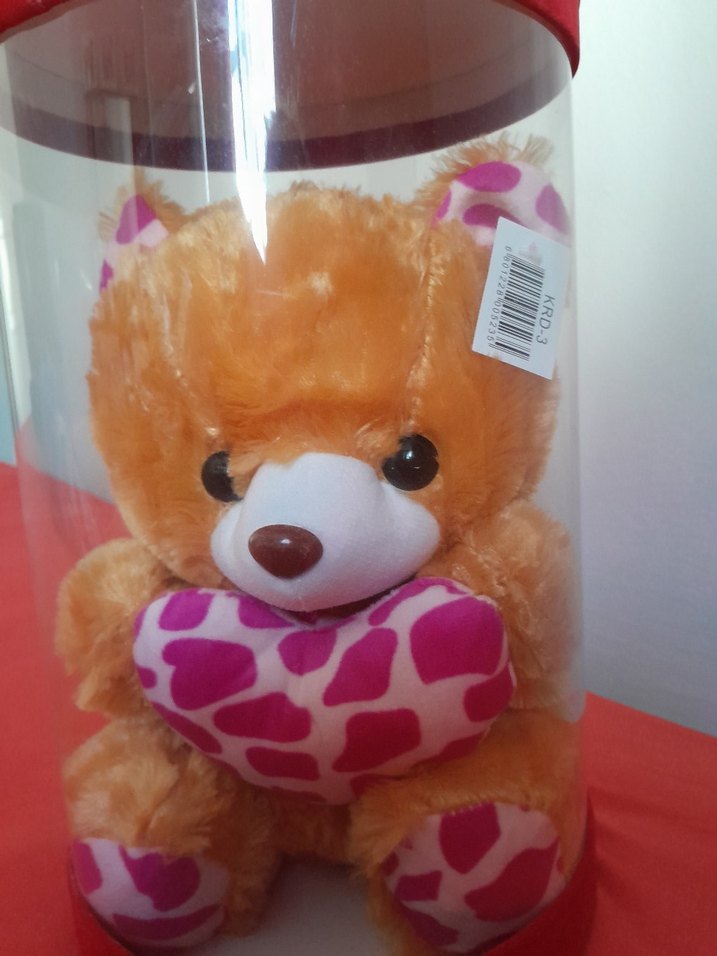 Yumuşak tüylü, renkli peluş ayıcık kalp desenli pembe kalp tutuyor. Şeffaf kutuda paketlenmiş.