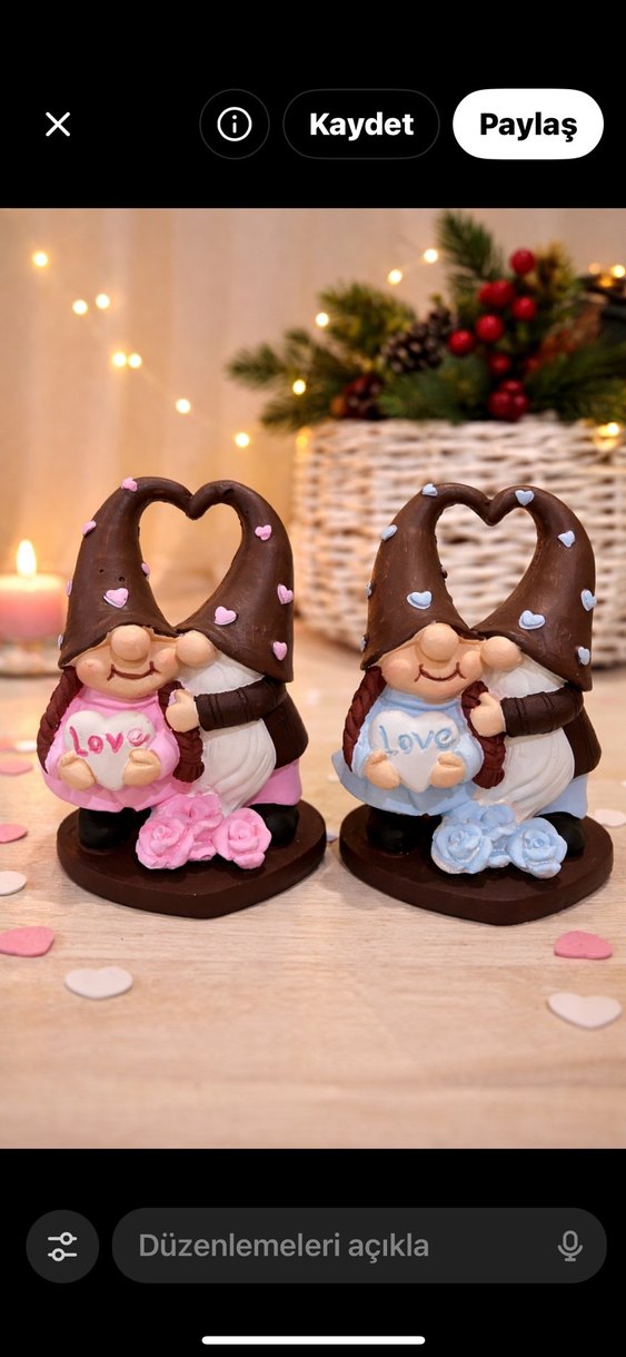 Pastel kahverengi figürin, kalp süslemeli şapkalı sevimli bir çifti, 'Love' yazılı tabelalar tutarken ve kalp şeklinde tabanda çiçeklerle birlikte gösterir.adet fiyatıdır