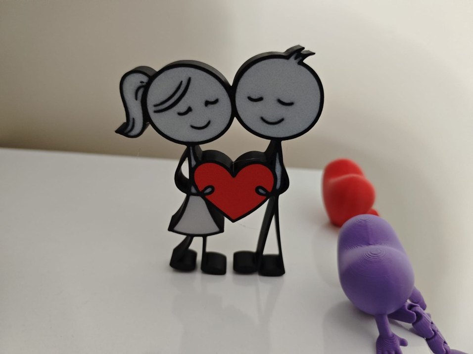 İki karakterin kırmızı bir kalbi birlikte tuttuğu gri figürin, sevgi ve birlikteliği simgeliyor.