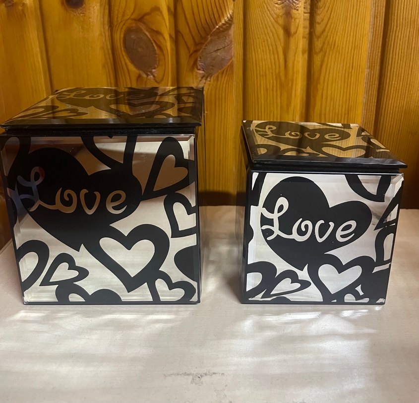 Ev dekorasyonu için kalp desenli ve 'Love' yazılı siyah dekoratif kutular.