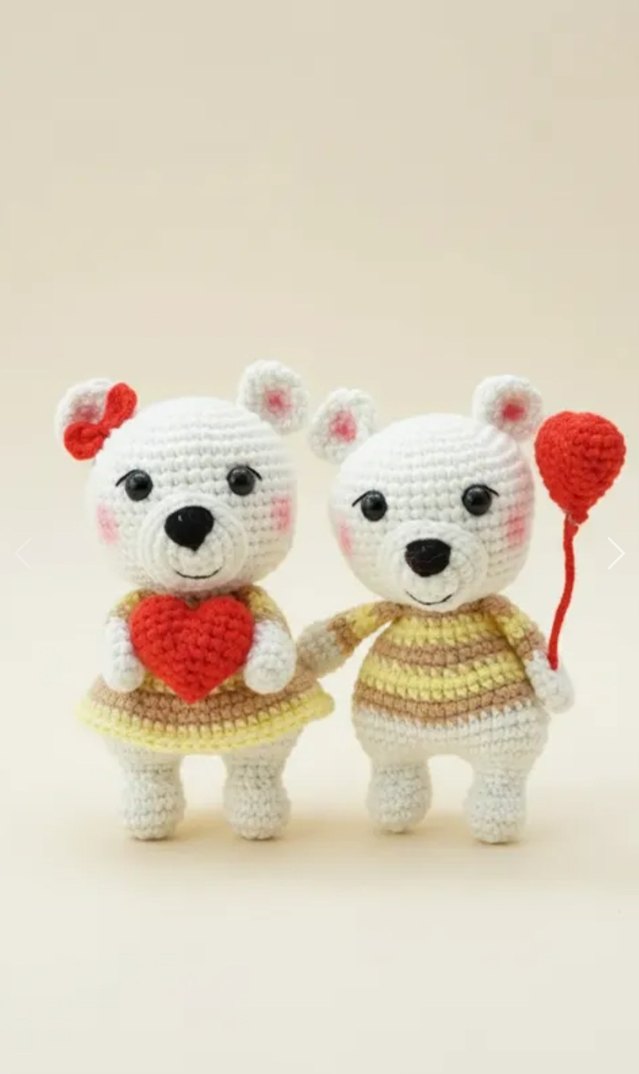 Kırmızı kalp ve balon tutan, sarı çizgili kıyafetli iki renkli beyaz örme ayıcık. Yumuşak ve şirin sevgi ayiciklar