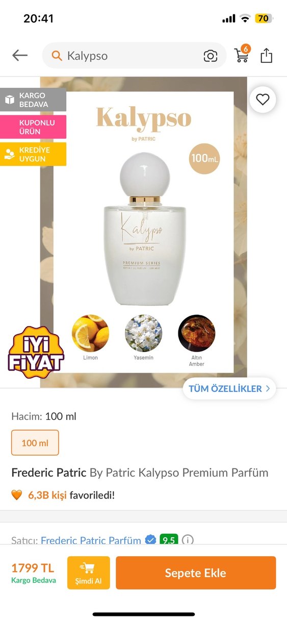 Kalypso by Patric, Premium Series kadın parfümüdür. 100 ml extrait de parfum içerir. Şık beyaz şişesi ve yuvarlak kapağıyla sunulur. (Fiyatta yardımcı olurum)