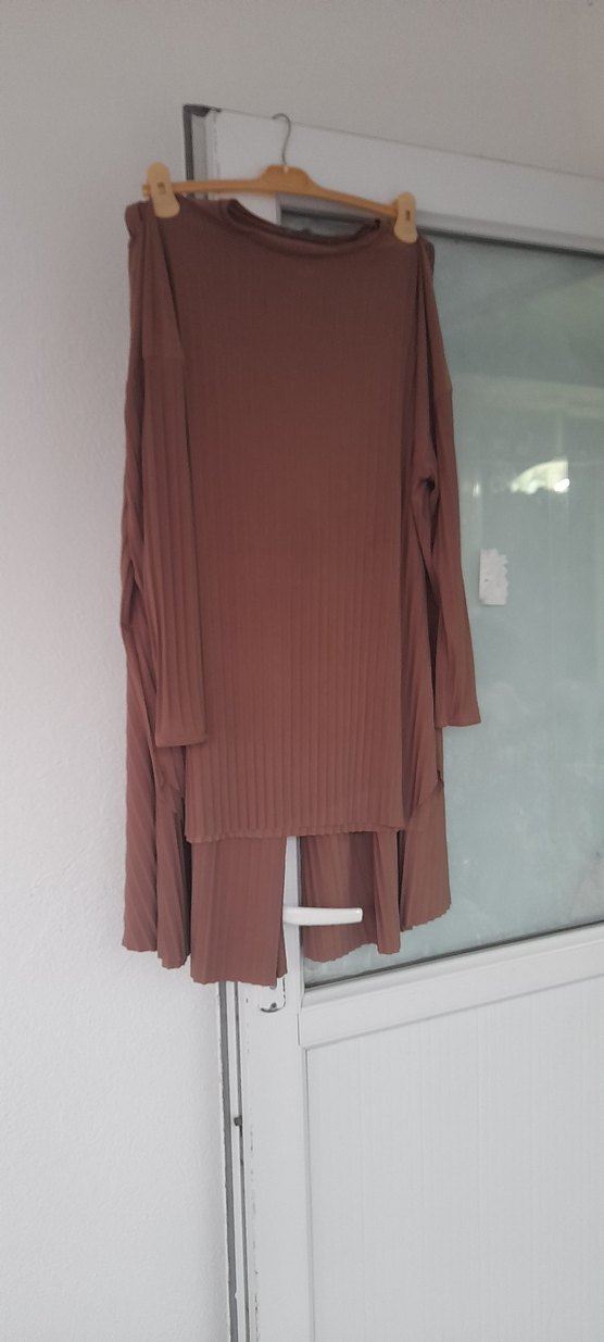 kamel renkli, uzun kollu, bol kesim ve pileli detaylı sandiy ikili takım .ütü içermeyen rahat bir modeldir.
