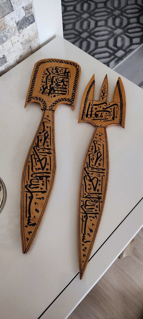 Kamel renginde, koyu desenlerle süslenmiş geleneksel ahşap çatal ve kaşık seti.