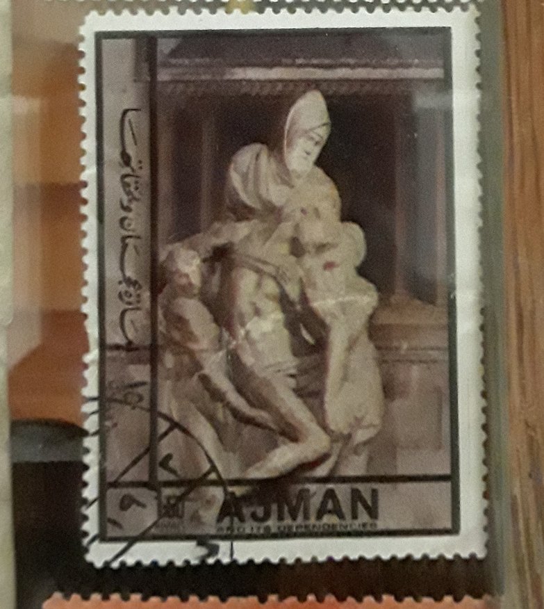 Koyu kamel renginde figürin, insan figürlerini detaylı bir sahnede gösteriyor. İnce işçilikle hazırlanmıştır. pul.