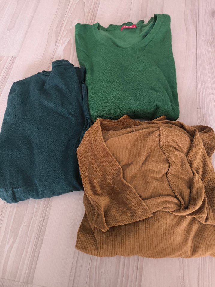 Kamel renkte, uzun kollu ve yuvarlak yakalı, yumuşak keten kumaştan salaş hamile kazağı, günlük kullanım için uygundur.