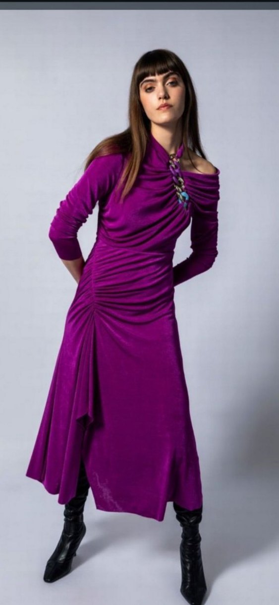 yakasında çok şık bi aksesuarı var , uzun kollu , kadife ipeksi kumaş mor uzun elbise. Modern ve avangart tarzda, romantik akşamlar için ideal. aşırı kaliteli bir parça 2 defa giydim herhangi bir sorunu yoktur