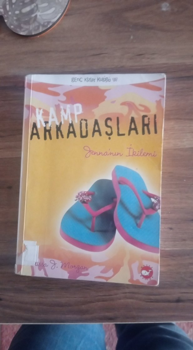"Kamp Arkadaşları - Jennanın İkilemi" adlı roman, Jenna'nın kamp sırasında yaşadığı ikilemleri konu alıyor. Kapakta yazlık terlikler yer alıyor.