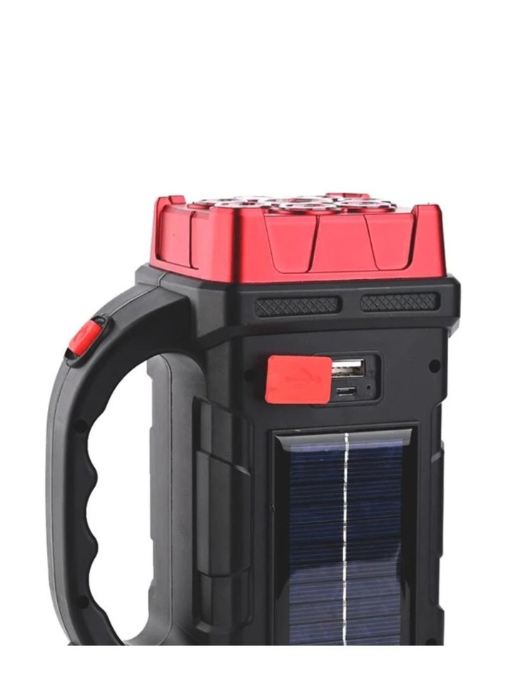 Kırmızı-Siyah renkte, şarjlı, solarlı, el feneri, taşıma kolaylığı sağlayan saplı kamp feneri.