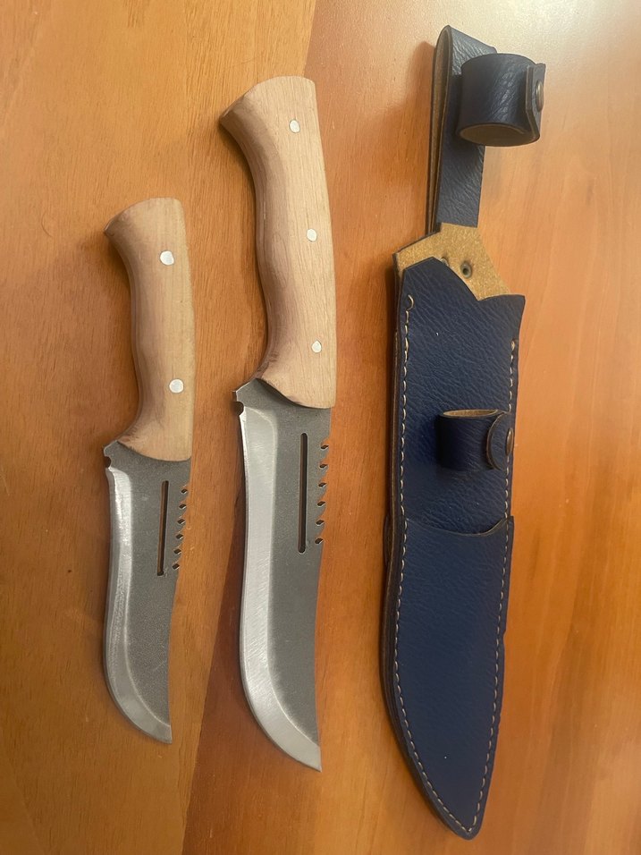 İki adet bej saplı bıçak ve koyu renk deri kılıf seti. Bıçaklar sağlam bıçaklara ve ergonomik ahşap saplara sahiptir. Kılıf taşıma için güvenli halkalar içerir.