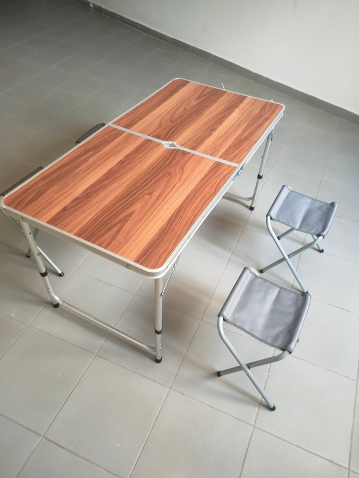 kamp masası 60*120cm 4 tabure hediyeli en büyük boy çanta tipi katlanır çanta tipi kamp masası marka uniganpjng yurt dışı ürünü Parlak kahverengi ahşap görünümlü katlanabilir masa ve gri kumaşlı iki katlanabilir sandalyeden oluşan set. Taşınabilir kullanım için uygundur.