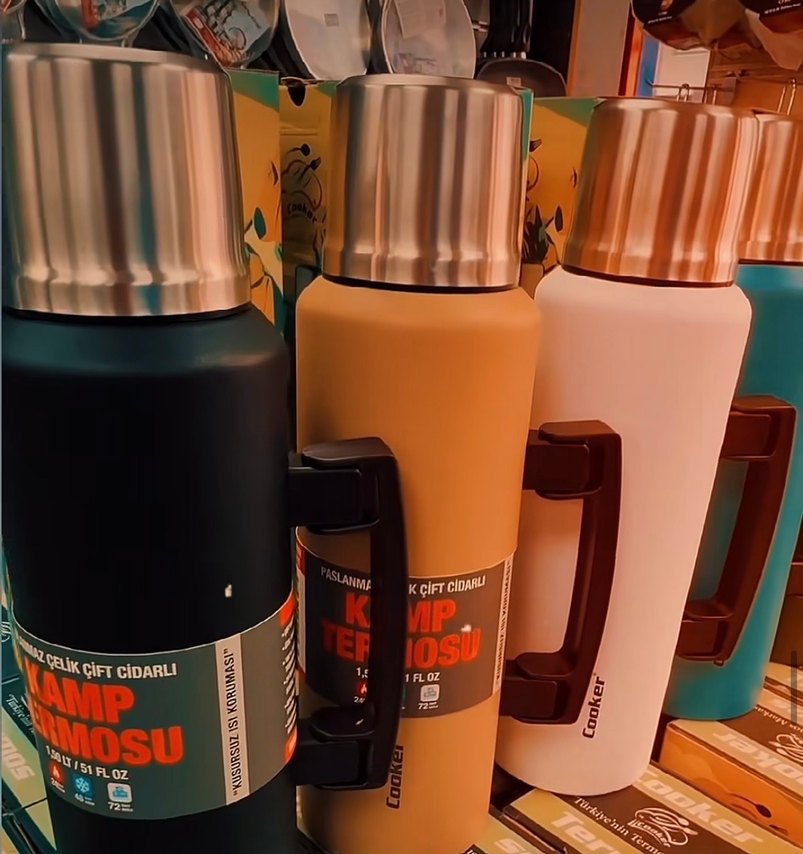 , paslanmaz kamp termosu. Koyu camel renkli, tutma kulplu ve içecekleri sıcak tutar. ☕ 1,5 litredir renkleri mevcut