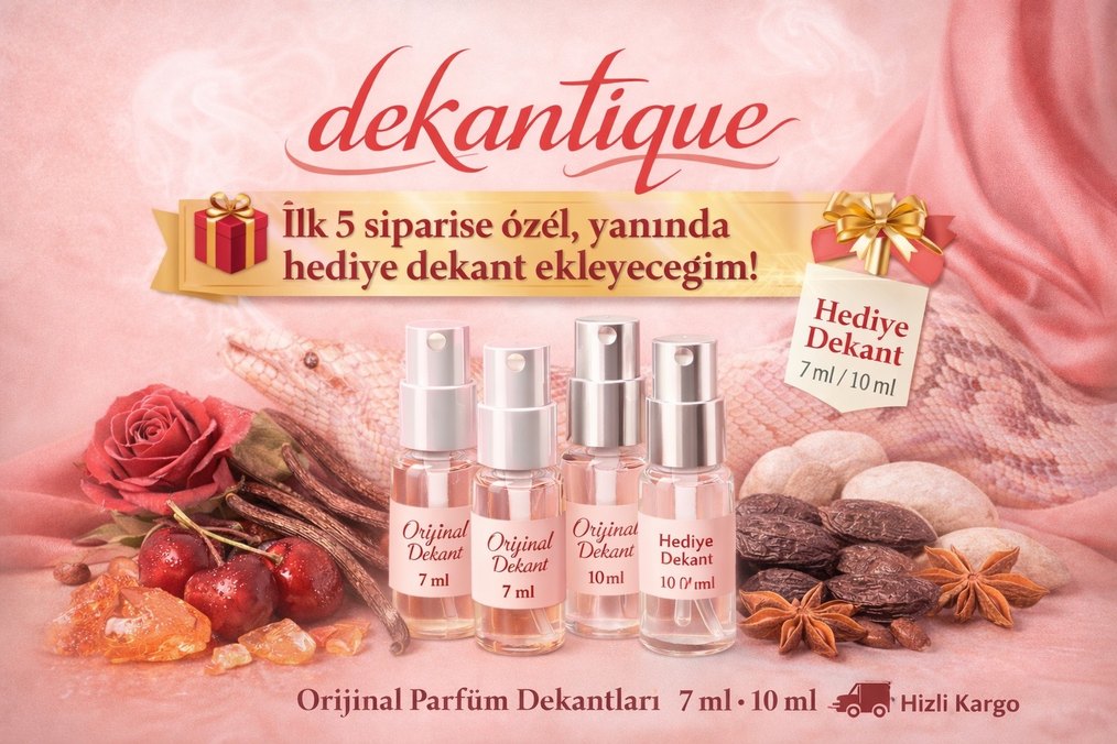 Orijinal parfüm dekantları 7ml ve 10ml boyutlarında, ilk 5 siparişe özel 5ml 7ml hediye dekant ile sunulmaktadır. Denemek veya seyahat için uygundur.