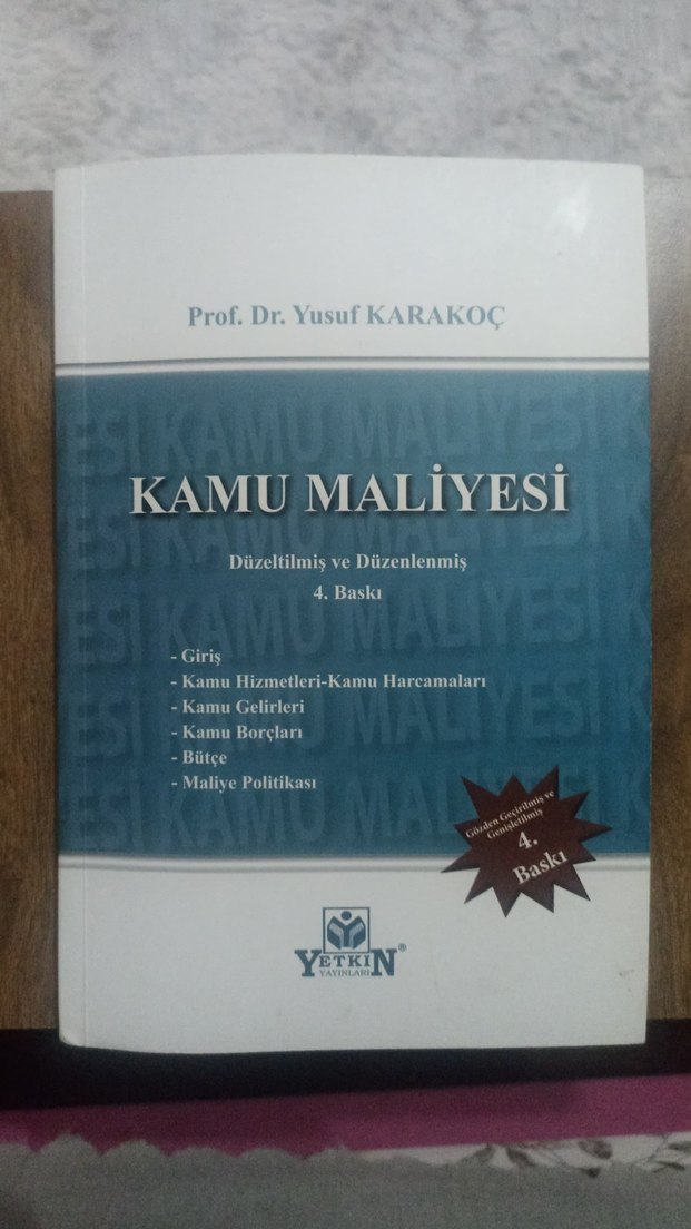 kitap kullanilmadi sadece 5 sayfa falan çizili prof. Dr. Yusuf Karakoç'un Kamu Maliyesi kitabı, kamu hizmetleri, gelirleri, borçları, bütçe ve maliye politikası konularını içeren 4. baskı, düzeltilmiş ve düzenlenmiş.