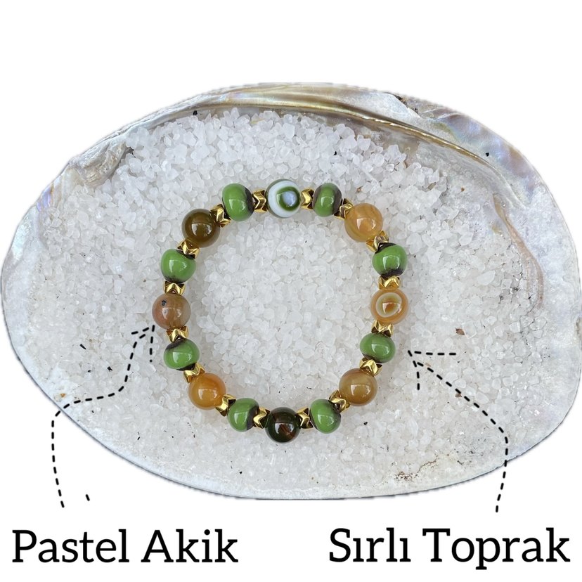 Hafif bağlama desenli, akik taşı ve sırli toprak boncuklardan oluşan khaki renkli bileklik, rahat bohem tarzını yansıtıyor. Günlük kullanıma uygun.