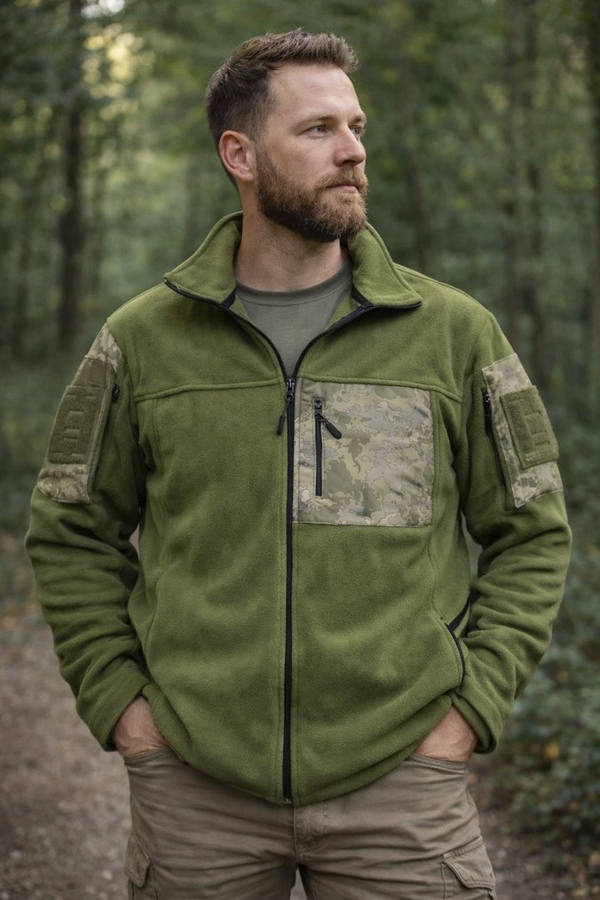 Erkekler için haki renk polar ceket, uzun kollu, bisiklet yaka ve ön fermuarlıdır. Göğüs cebinde ve kollarda kamuflaj detayları bulunur, rahat kesimlidir ve dış mekan ile sokak stiline uygundur.